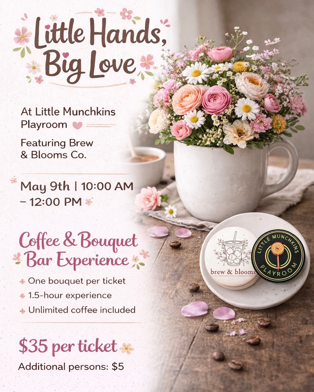 Sip, Snip and celebrate mom! Coffee and bouquet making is the perfect blend for Mother’s Day! Little Munchkins Playroom is partnering with Brew & Blooms Co. They will provide a coffee bar station and a bouquet bar for you to enjoy.